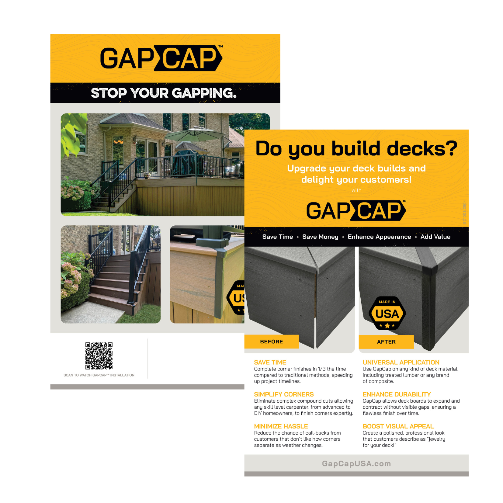 DOWNLOADABLE RESOURCES INSTRUCTIONS MARKETING RESOURCES Installation Instructions for TopCap Corners with Posts FasciaCap on a Stair Riser Installation Instructions FasicaCap Installation Instructions TopCap Retrofit Installation Instructions TopCap Plug Installation Instructions GapCap 1-Sheeter Double-Sided Product Overview Sheet Contractor Info Sheet Poster Square Cards WARRANTY GapCap USA Product Warranty